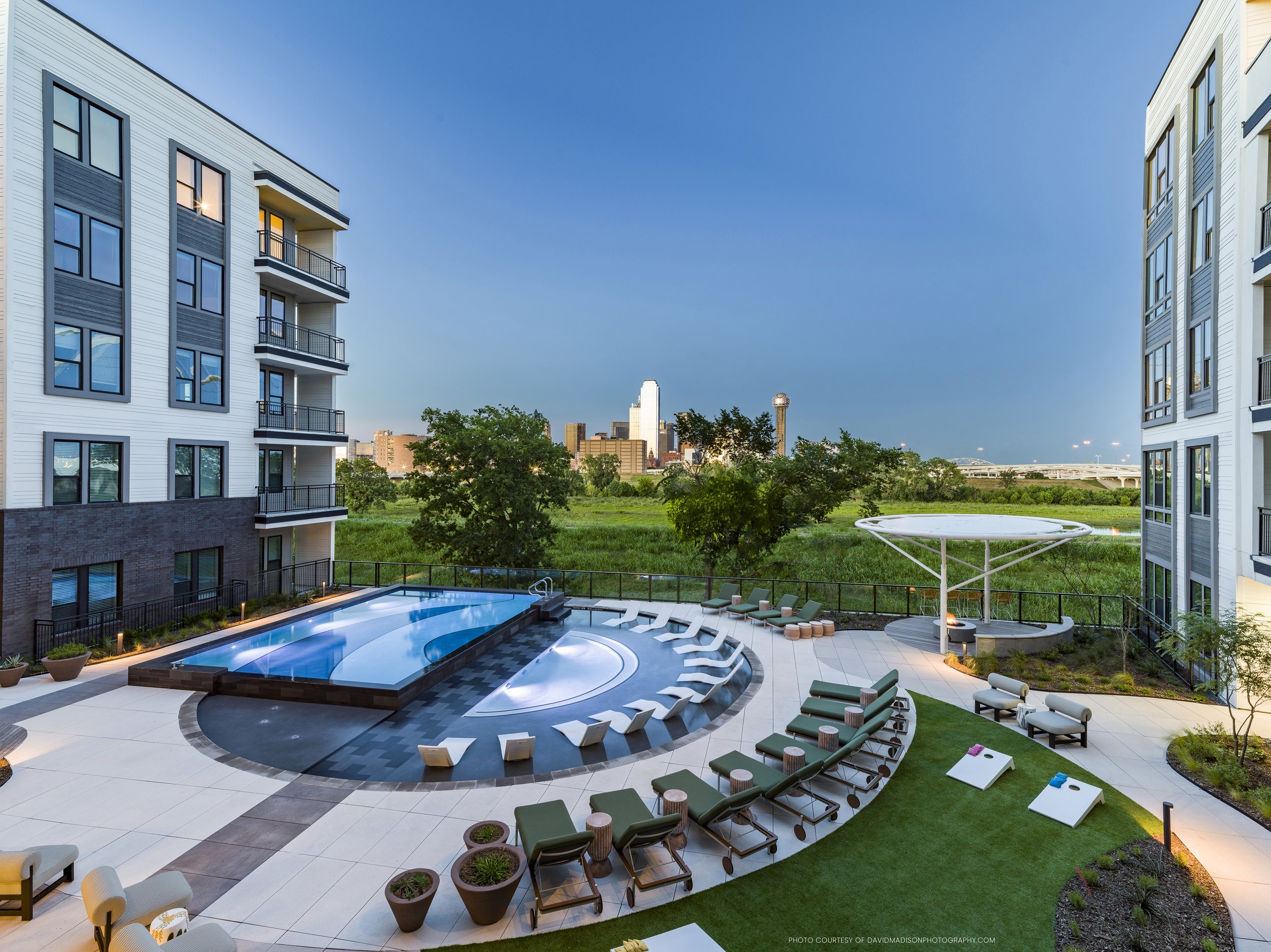 This mixed-use community is located along the levee of the Trinity River, just west of Downtown Dallas and adjacent to the Trinity Groves neighborhood. The site is situated between the two iconic Calatrava bridges, providing direct access to Trinity Overlook Park and the Skyline Trail. The project integrates the dynamic urban context with the historic river infrastructure and natural systems, using contemporary materials, layered architectural forms, and native plantings to connect the site’s heritage with modern mixed-use development.